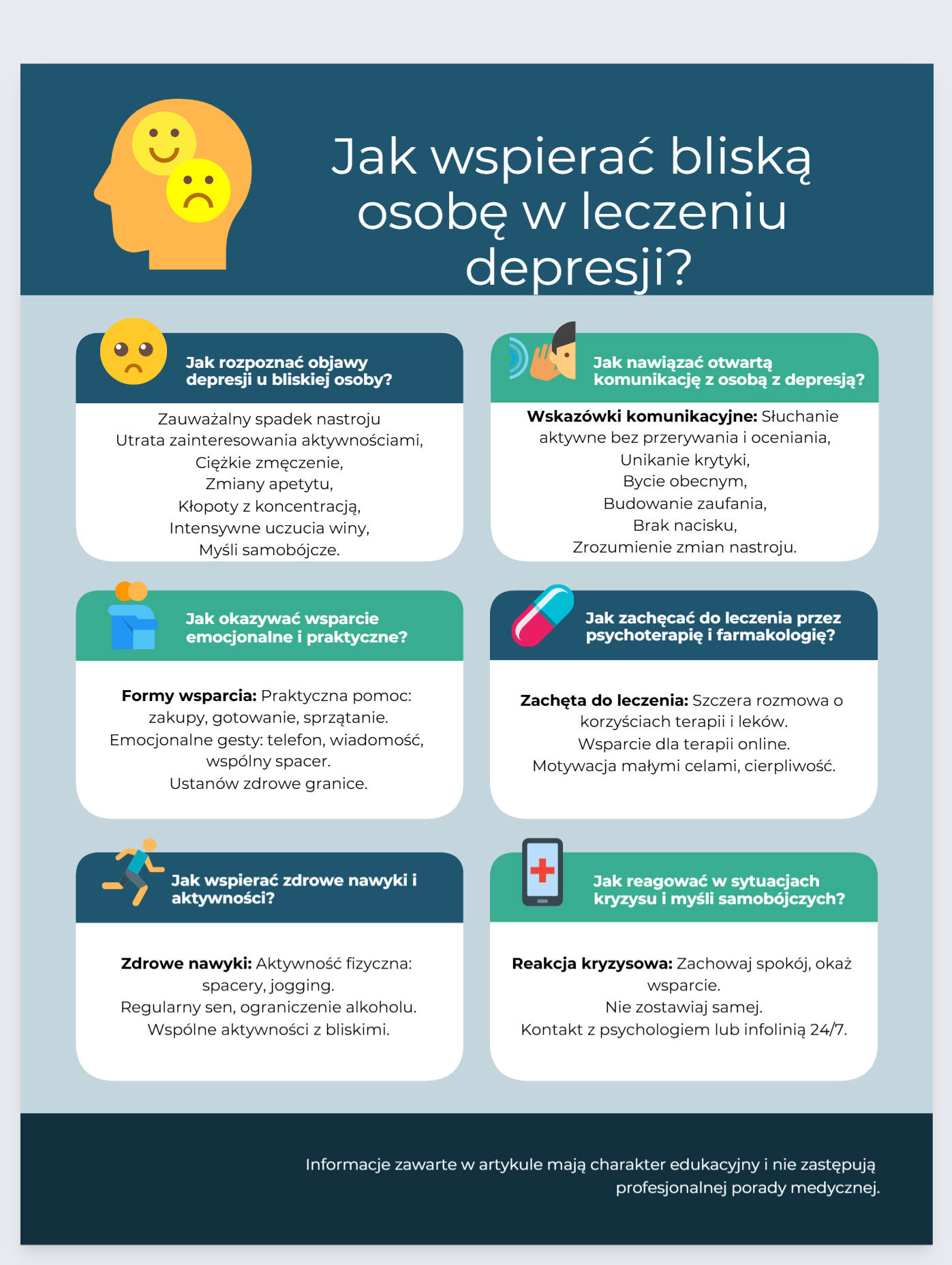 Depresja kliniczna (MDD — Major Depressive Disorder) dotyka około 280 milionów ludzi na świecie (WHO, 2023). W Polsce na depresję leczy się ok. 1,5 mln osób, jednak szacuje się, że kolejne 1–1,5 mln nie trafia do lekarza. Średni czas od wystąpienia pierwszych objawów do rozpoczęcia leczenia wynosi w Polsce 6–8 lat. Jako osoba bliska komuś z depresją masz realny wpływ na skrócenie tego czasu — badania pokazują, że pacjenci z aktywnym wsparciem bliskich mają o 50% wyższą adherencję (stosowanie się do zaleceń) w leczeniu farmakologicznym [1]. Ten artykuł to konkretny przewodnik: co obserwować, jak rozmawiać, dokąd zadzwonić i czego się spodziewać na kolejnych etapach leczenia.