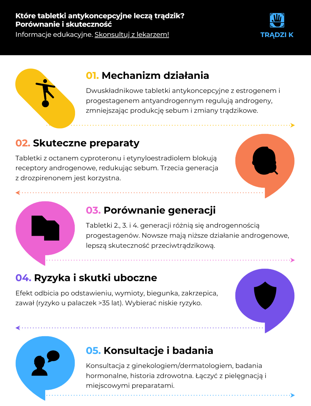 Połączenie doustnej antykoncepcji z leczeniem dermatologicznym oraz odpowiednią pielęgnacją skóry stanowi kluczową strategię w terapii trądziku. Większość doustnych środków antykoncepcyjnych przynosi poprawę zarówno w przypadku trądziku, jak i hirsutyzmu [6]. Dzięki hormonom regulującym poziomy androgenów, antykoncepcja może skutecznie łagodzić objawy tego schorzenia. Jednocześnie, miejscowe preparaty, takie jak retinoidy i antybiotyki, wspierają proces gojenia istniejących zmian.